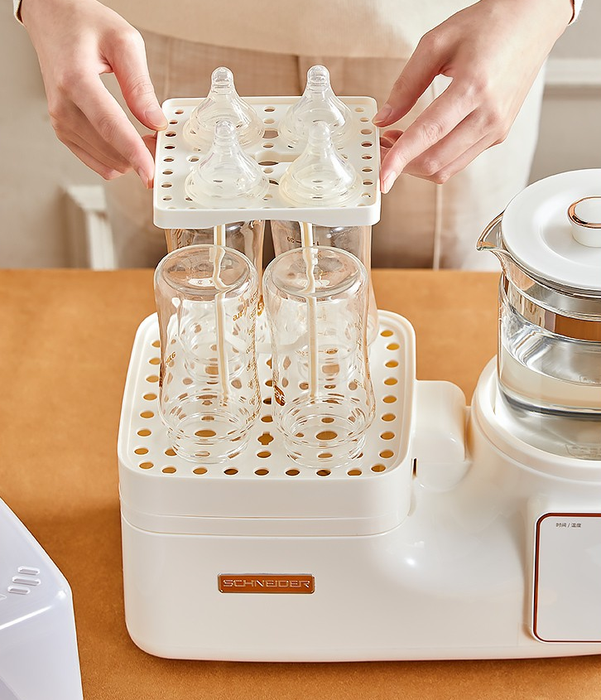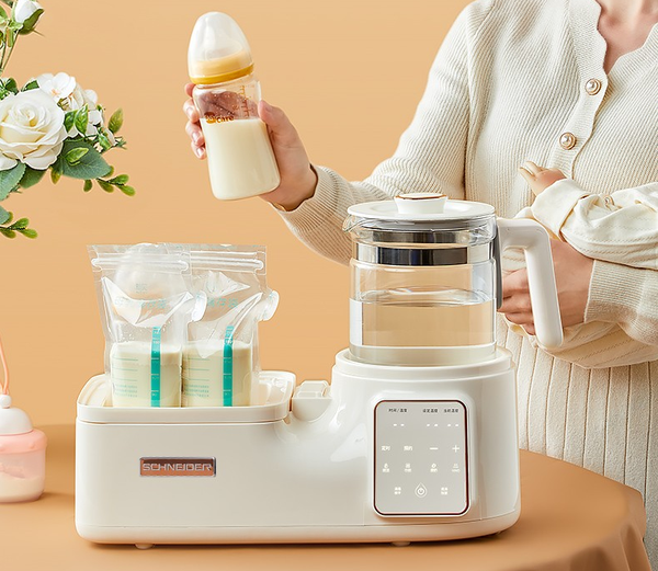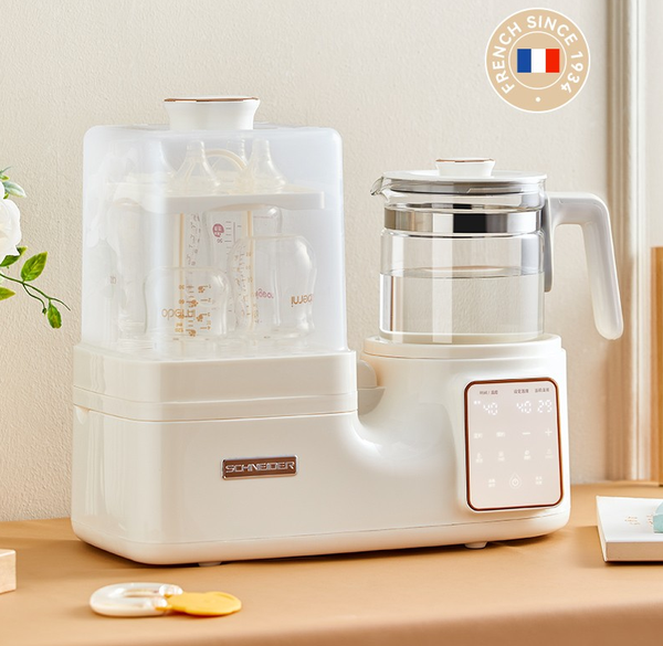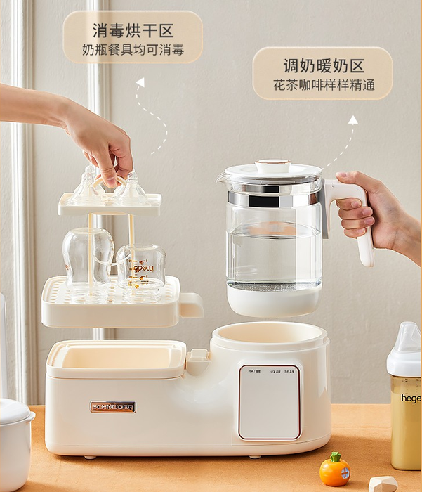 1:独立恒温壶跟多功能调奶器怎么选? 很多新手妈妈觉得恒温壶一样可以冲泡奶粉,水温也是精准可调的,但是这样你可能就需要多安排奶瓶消毒柜、温奶器、以及辅食锅……这些都是喂养宝宝必备的。 SCHNEIDER多功能调奶器左右分区设计,双芯片双系统独立操作互不干扰,调奶、温奶、消毒、做辅食、煮花茶样样都可以轻松搞定,一机多用省钱也省心。
