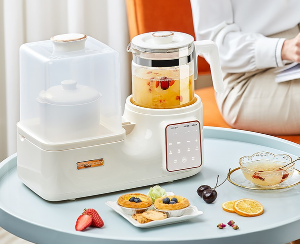 1、基础功能:烧水壶功能、恒温壶功能; 烧水壶功能:水温从常温加热到100°C。 恒温壶功能:设置好恒温的温度,水温升温到恒定值,即停止升温,保持在恒定值; 如调整到45°,常温29°C的水倒入,升温到45°C即停止升温。 2、升级功能:辅食机、暖奶器、消毒锅、烘干功能; 辅食机功能:宝宝到了吃辅食的时候,可以蒸基本的辅食,不用额外买其他产品。 暖奶器功能:不能确保宝宝每次都喝完泡的奶粉,倒掉又很可惜,冷藏的母乳袋,或者上次没喝完的奶粉,提前30分钟放去暖奶,可以保留母乳、奶粉的初始营养,不破坏营养成分。